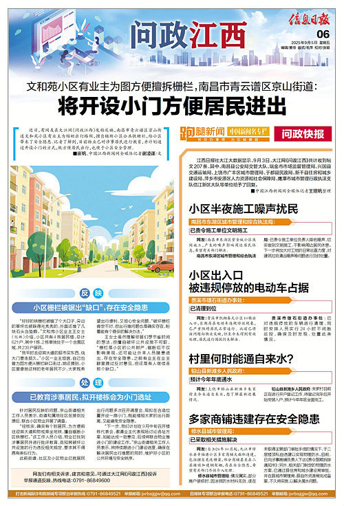近日,有网友在大江网《问政江西》发帖反映,南昌市青云谱区京山街道文和苑小区有业主为缩短出行路程,擅自锯断小区公共铁栅栏,给小区带来了安全隐患。记者了解到,目前物业已对涉事居民进行教育,并计划通过开设小门的方式,既方便居民出行,也便于小区安全管理。