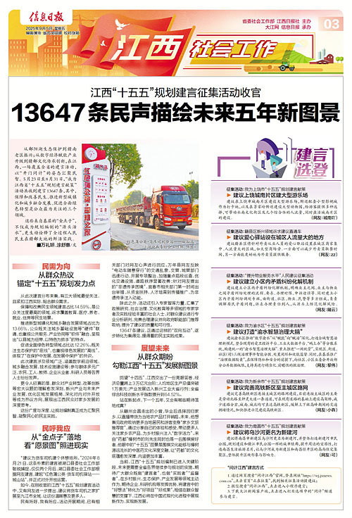 当前,江西“十五五”规划编制已进入关键阶段,未来更需要全省各界继续参与规划的实施。期待广大群众既做“建言者”,也做“实践者”“监督者”,在乡村振兴、生态保护、产业发展等领域主动作为,期待企业、科研机构等发挥优势,将建言中的“好想法”转化为“好项目”“好成果”。相信在群众智慧的支撑下,江西必将在中国式现代化进程中展现新作为、实现新发展。