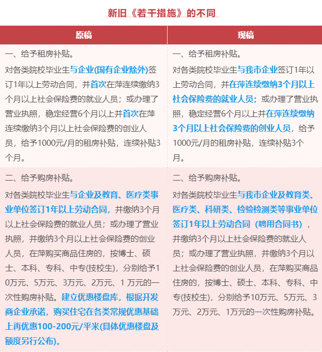 在租房补贴方面,放宽了条件限制,删除了“首次在萍连续缴纳3个月以上社会保险费”中“首次”的要求,取消了“国有企业除外”的限制,让更多毕业生能够受益;在购房补贴方面,扩大了用人单位范围,将科研类、检验检测类等事业单位纳入其中,使更多在不同类型单位就业的毕业生有机会获得购房补贴,增强了政策的普惠性和覆盖面。