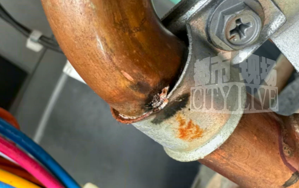 事后董先生了解到,是由于氟利昂泄漏,空调直接失去了控温功能。董先生表示,空调此前一直正常运转,从未出现异常。经过售后排查,故障原因是因内部线路与铜管接触产生火花,导致铜管破裂、制冷剂泄漏,机器彻底瘫痪。