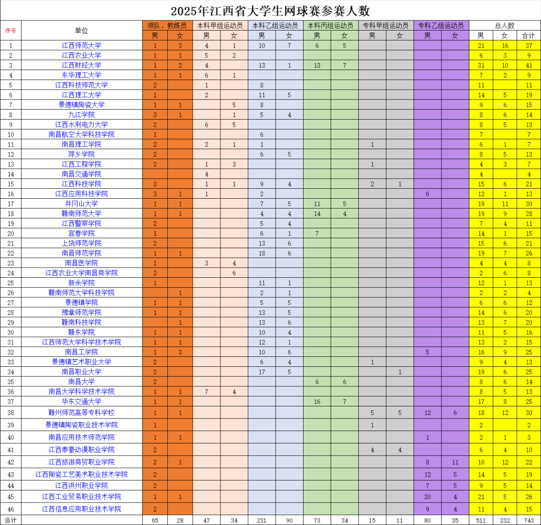 全省46所普通高校代表队领队、教练员、运动员合计人数743人。