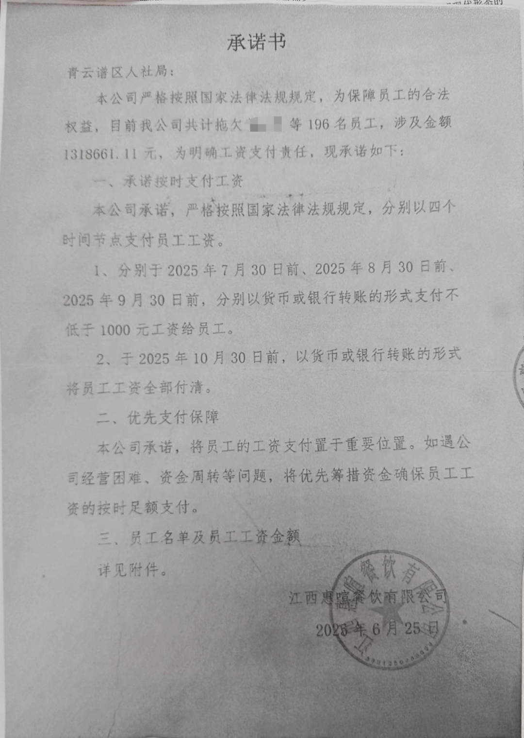 “工资一直拖着也不发放,就有员工陆续向政府部门反映,公司就制作了一份支付承诺书。”青山向记者提供了一份6月25日惠喧公司致青云谱区人社局的承诺书,其中载明:“目前我公司共拖欠曾某等196名员工,涉及金额1318661.11元”。