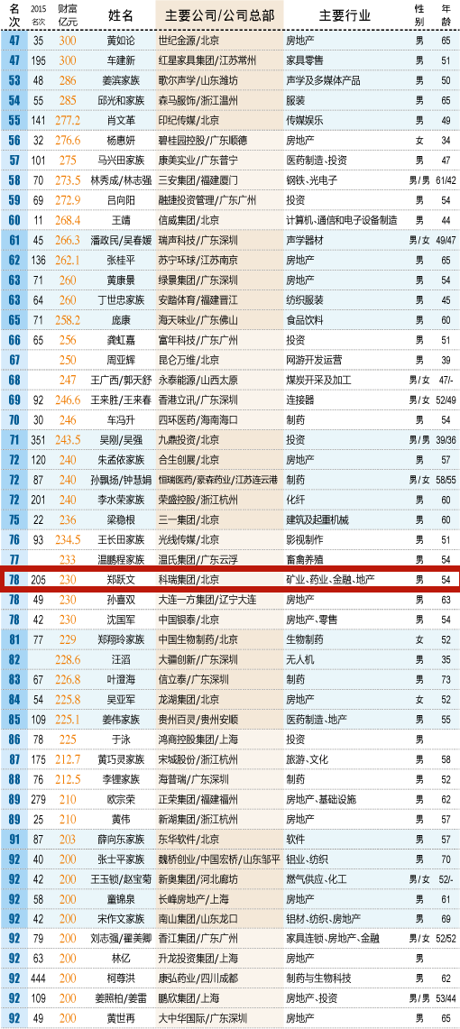2016年“新财富500富人榜”出炉,其中郑跃文凭借230亿元的财富值成为江西首富,在全国排第78位。