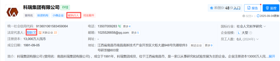 据天眼查,郑跃文担任法定代表人的科瑞集团目前仍被列为被执行人。