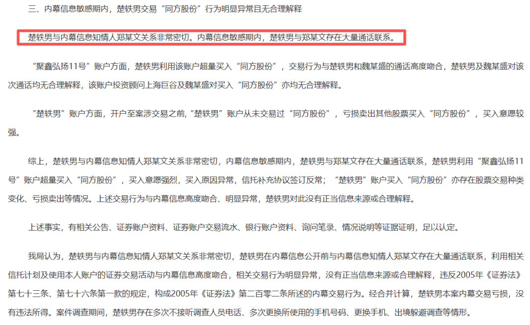 北京证监局早在2017年就注意到异常交易,认定楚轶男与内幕知情人郑跃文关系密切,交易行为与内幕信息高度吻合,却没有正当来源或合理解释。