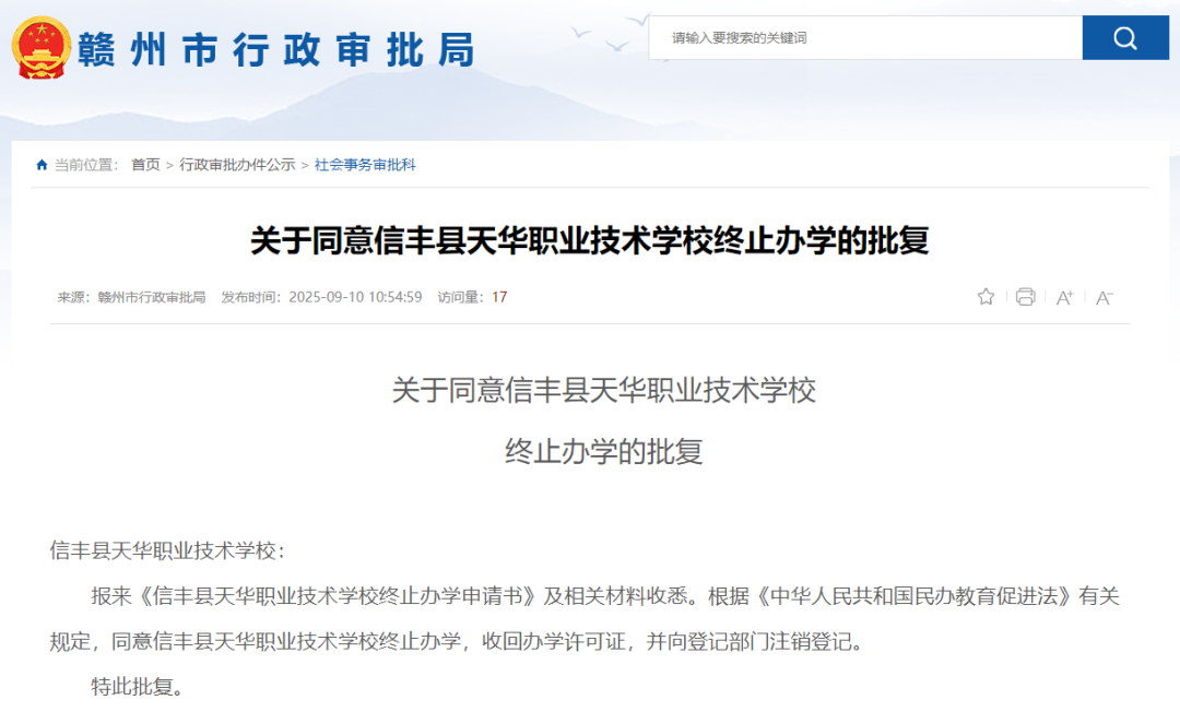 9月11日,赣州市行政审批局官网消息,根据《中华人民共和国民办教育促进法》有关规定,同意信丰县天华职业技术学校终止办学,收回办学许可证,并向登记部门注销登记。