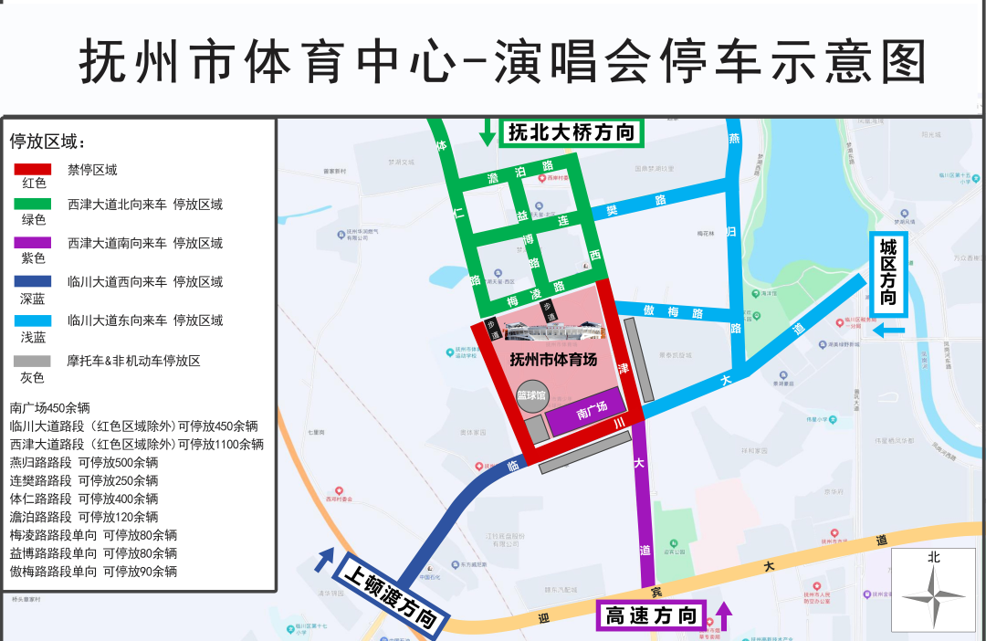 2.抚州高速口、迎宾大道方向来车,可停放在西津大道(临川大道至迎宾大道段)和体育中心南广场内(停车示意图中紫色区域)。