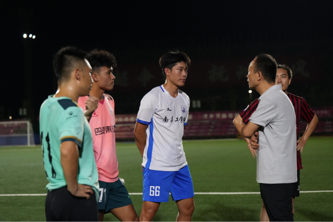 19时许,赣东学院体育场灯光准时点亮。主力队员已全部就位,积极投入热身。教练的指令划破夜空:“注意跑位!”“加快传球!”队员们全力奔跑、拼抢,汗水在灯光映照下格外醒目。在高强度的对抗训练中,队伍展现出优良的竞技状态,传球、射门、防守等各个环节严密有序、默契十足。