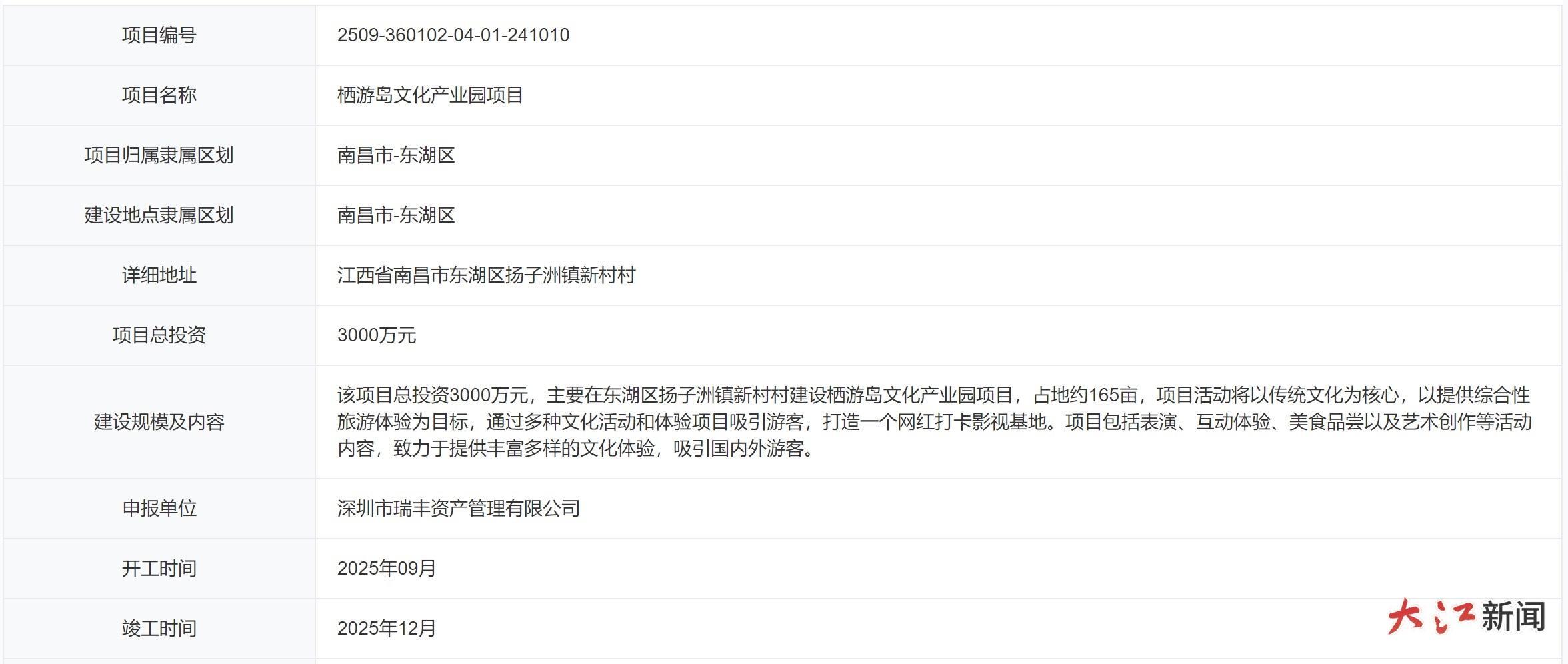 大江网/大江新闻客户端讯 全媒体记者谢梦丽报道:近日,江西省投资项目在线审批监管平台公示了位于南昌市东湖区扬子洲镇的新项目——栖游岛文化产业园项目备案信息,总投资3000万元,预计9月开工,今年12月份竣工。
