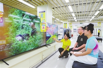 今年以来,新余市积极实施消费品“以旧换新”政策,通过扩大补贴范围和提高补贴力度,进一步激发本地消费市场活力。图为9月10日,消费者在渝水区一个家电卖场内选购电视机。通讯员 廖海金摄
