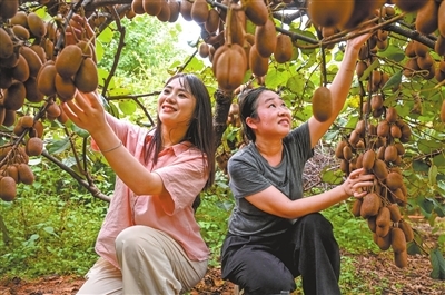 近年来,奉新县上富镇不断激活乡贤资源,将人才优势转化为发展优势,助力乡村振兴。图为9月11日,游客在乡贤投资的果园采摘猕猴桃。特约通讯员 邓建刚摄