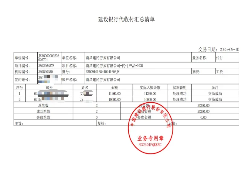 南昌职教城管理委员会 回复 :经与中铁四局沟通,依据考勤记录,艾某保、万某英夫妇应得薪资21260元,已于2025年8月完成核发,因系统故障导致款项退回。目前中铁四局核实完毕后已于9月10日重新打款,请留意查收账户资金。