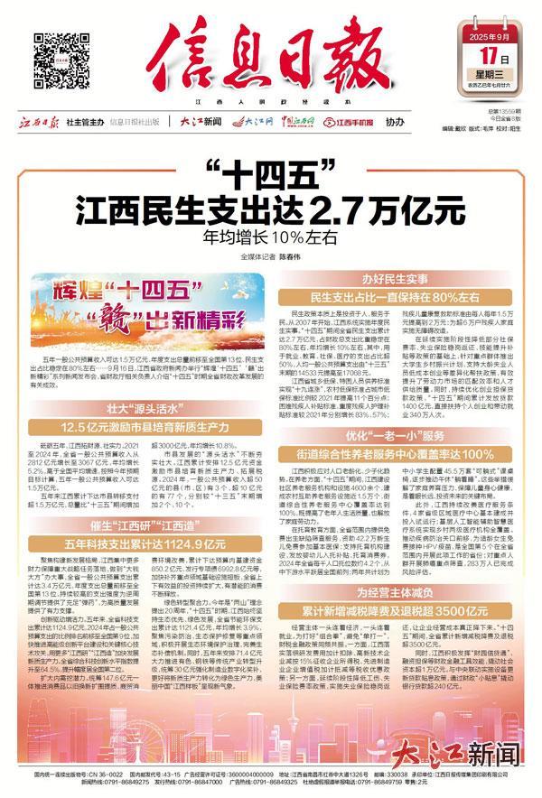 民生政策本质上是投资于人、服务于民。从2007年开始,江西系统实施年度民生实事。“十四五”期间全省民生支出累计达2.7万亿元,占财政总支出比重稳定在80%左右,年均增长10%左右,其中,用于就业、教育、社保、医疗的支出占比超50%,人均一般公共预算支出由“十三五”末期的14533元提高至17068元。