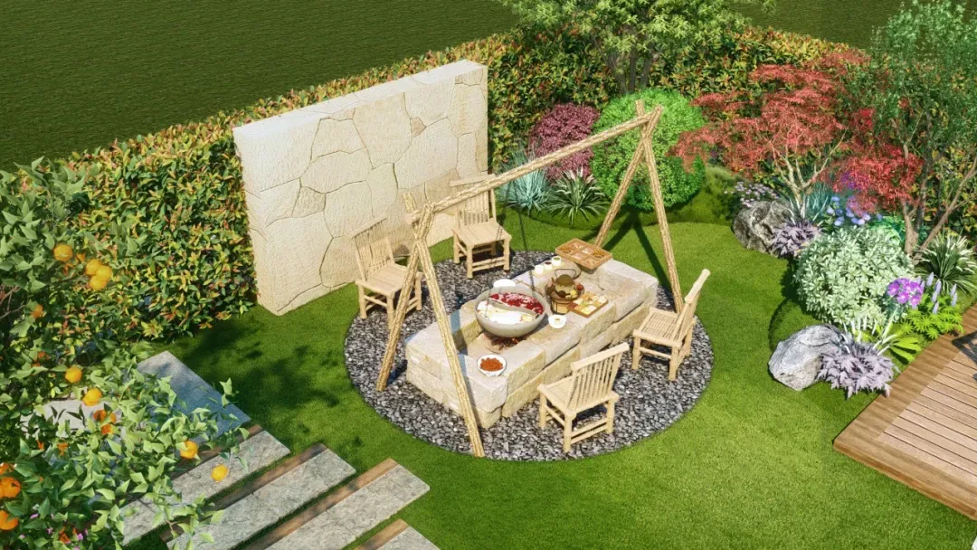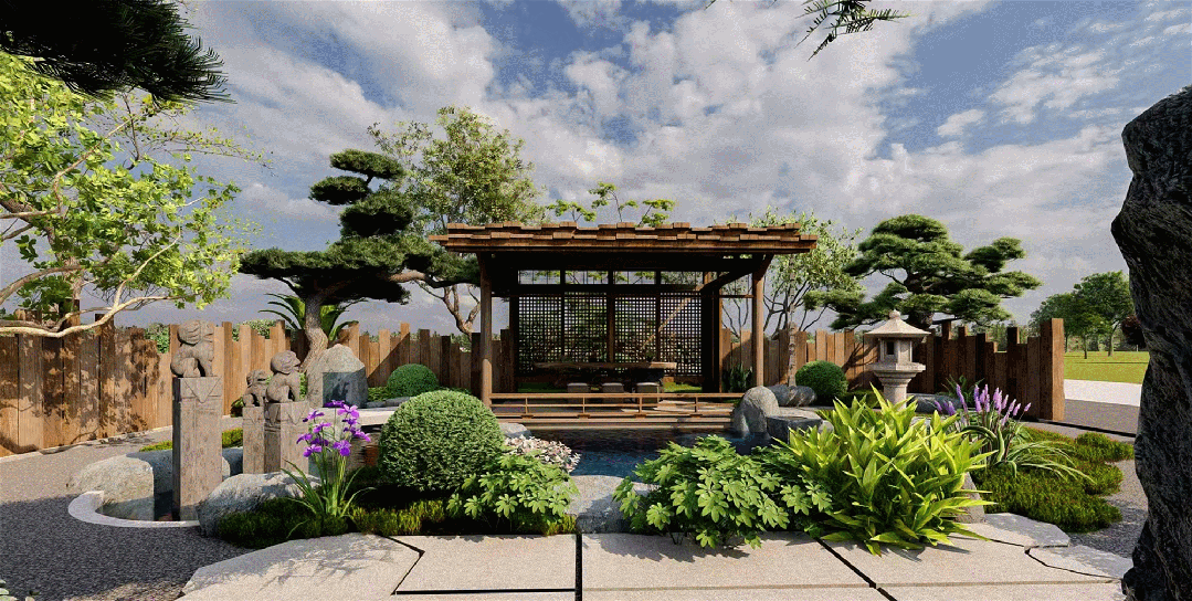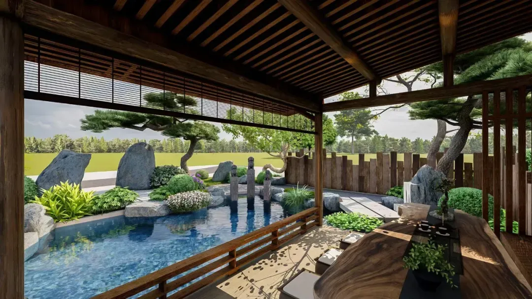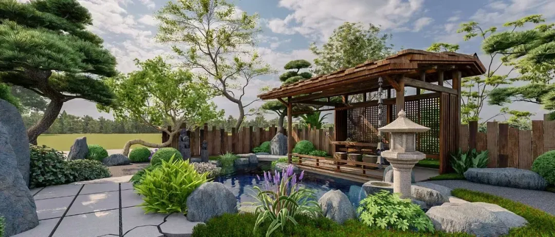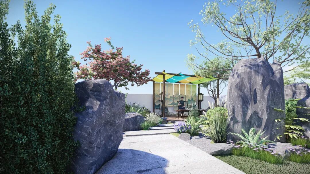 本设计以“自然野趣,舒适优雅”为核心思想,旨在打造一个以石为骨,水为脉,绿为衣的微型自然山水庭院。凉亭大胆采用彩色纱幔为顶,丰富光影的色彩变化,赋予传统山水园林新的感官体验。