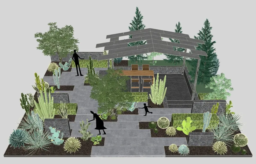 这是一座砾石护院,它像一片微缩的荒漠绿洲,在粗粝与坚韧中展现着独特的宁静与秩序。种植区以仙人掌和龙舌兰为主角,针叶林如同墨绿色的屏风,成为花园深沉的背景。