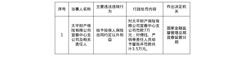 罚单显示,太平财产保险有限公司宜春中心支公司的主要违法违规行为是:给予投保人保险合同约定以外利益。