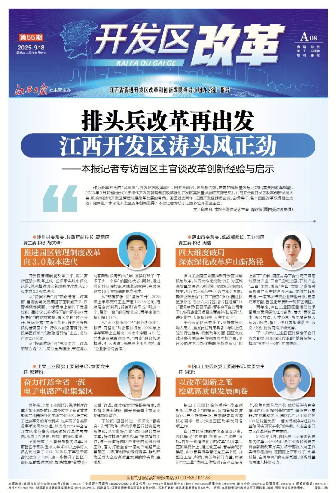 作为改革开放的“试验田”,开发区因改革而生、因开放而兴、因创新而强,未来的高质量发展之路也需要用改革赋能。2023年9月我省出台《关于深化开发区管理制度改革推动开发区高质量发展的实施意见》,并召开全省开发区改革创新发展大会,吹响新时代开发区管理制度改革发展的号角。回望过去两年,江西开发区踔厉奋发,奋楫笃行,各个园区改革取得哪些成效?如何进一步深化开发区改革创新发展?本报记者专访了江西多位开发区主官。