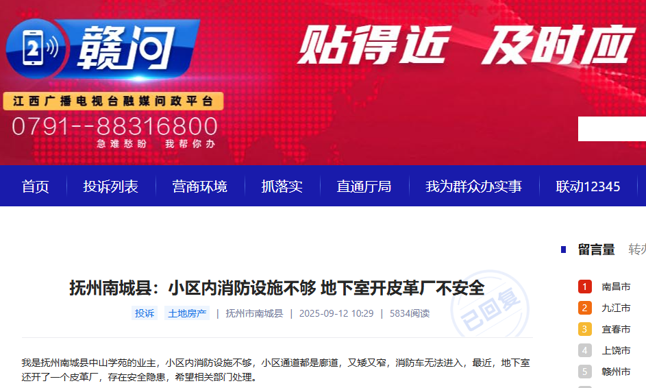 《赣问》平台转来的《 抚州南城县:小区内消防设施不够 地下室开皮革厂不安全 》已收悉。