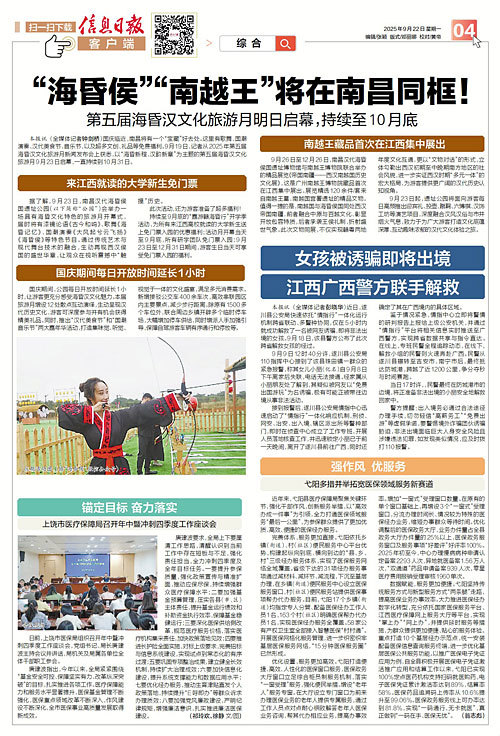 信息日报讯 (全媒体记者钟剑桥) 国庆临近,南昌将有一个“宝藏”好去处。这里有歌舞、国潮演奏、汉代美食节、音乐节,以及超多文创、礼品等免费福利。9月19日,记者从2025年第五届海昏汉文化旅游月新闻发布会上获悉,以“海昏新程、汉韵新章”为主题的第五届海昏汉文化旅游月9月23日启幕,一直持续到10月31日。