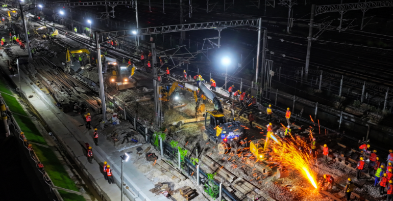 据介绍,施工现场,300余名施工人员、上百台机械设备,在四个深夜的“天窗”时间里,完成12组道岔、223米轨排的拆除、移出、组装与拼接等复杂工序,进行了一场多工种协同、多专业联动的“铁路站改大会战”。