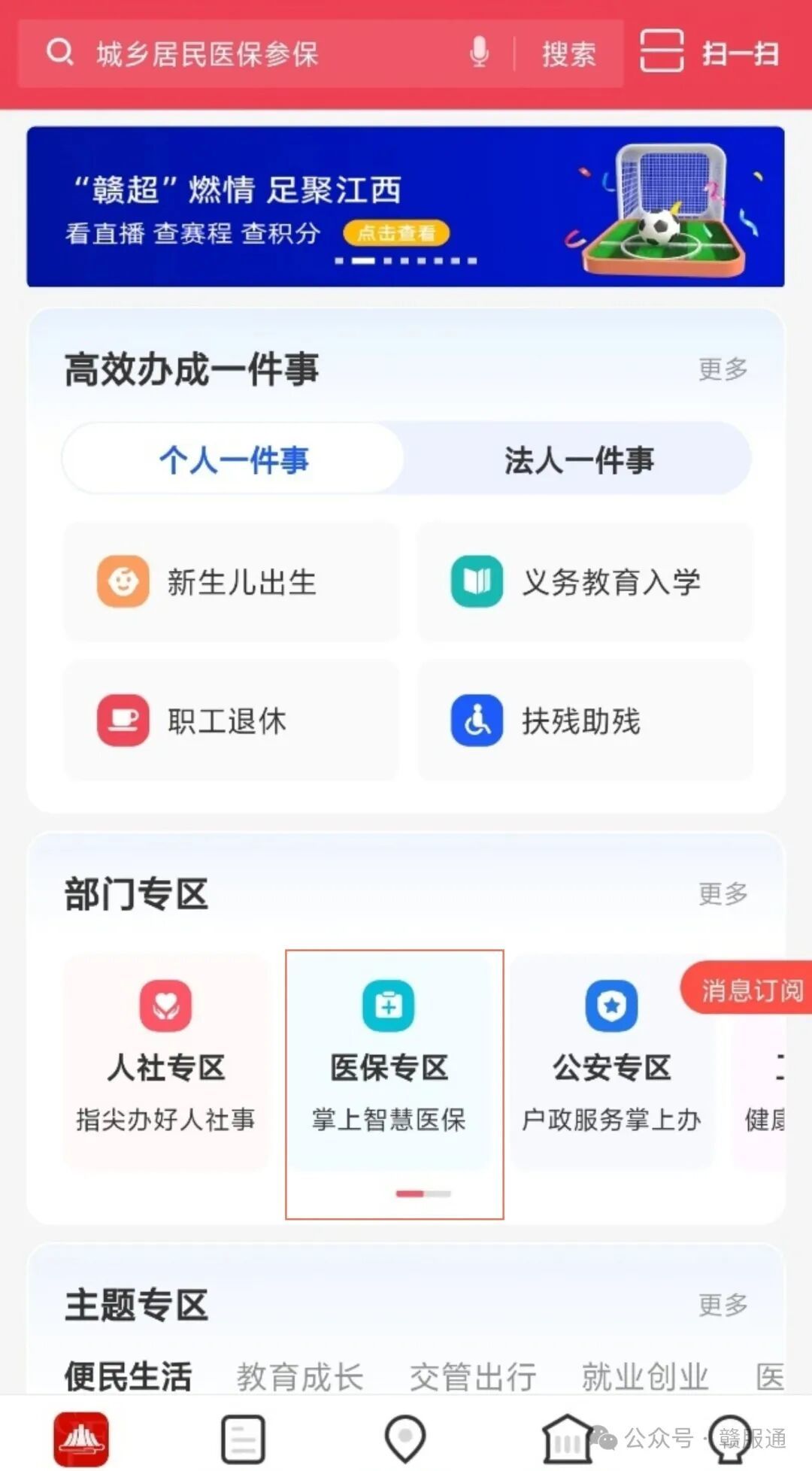 2.打开“赣服通”后,点击“医保专区”,下拉点击“生育津贴申报”。