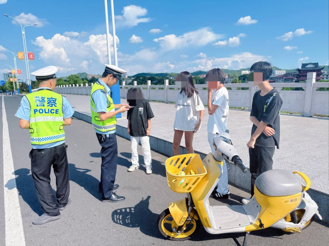 近日,瑞金市公安局交管大队在绵江路第四中学路段巡逻时,发现一名未成年人未佩戴安全头盔骑行共享电动自行车,并违规搭载另外三名未成年人。执勤交警立即拦停该车辆,对骑行者进行严厉批评教育,并依法作出处罚。
