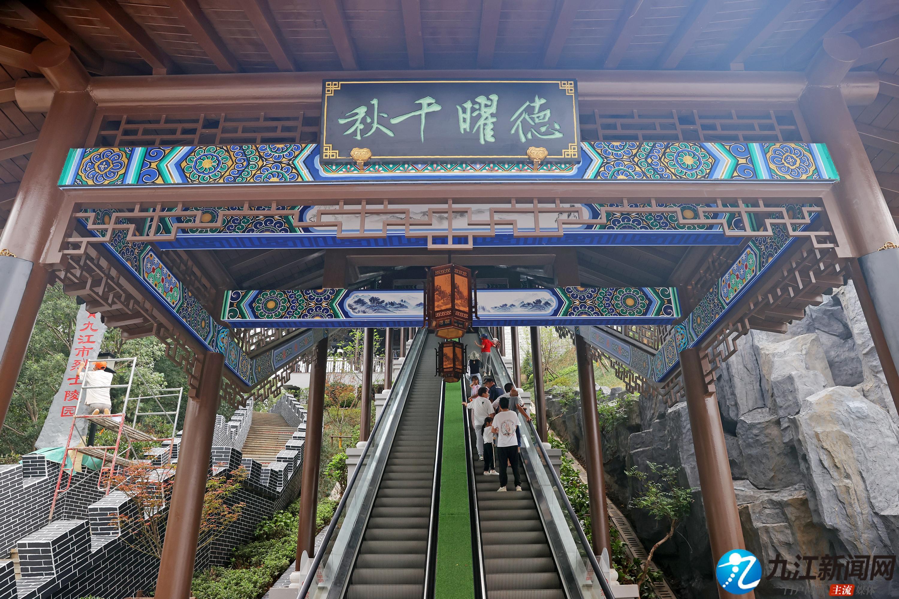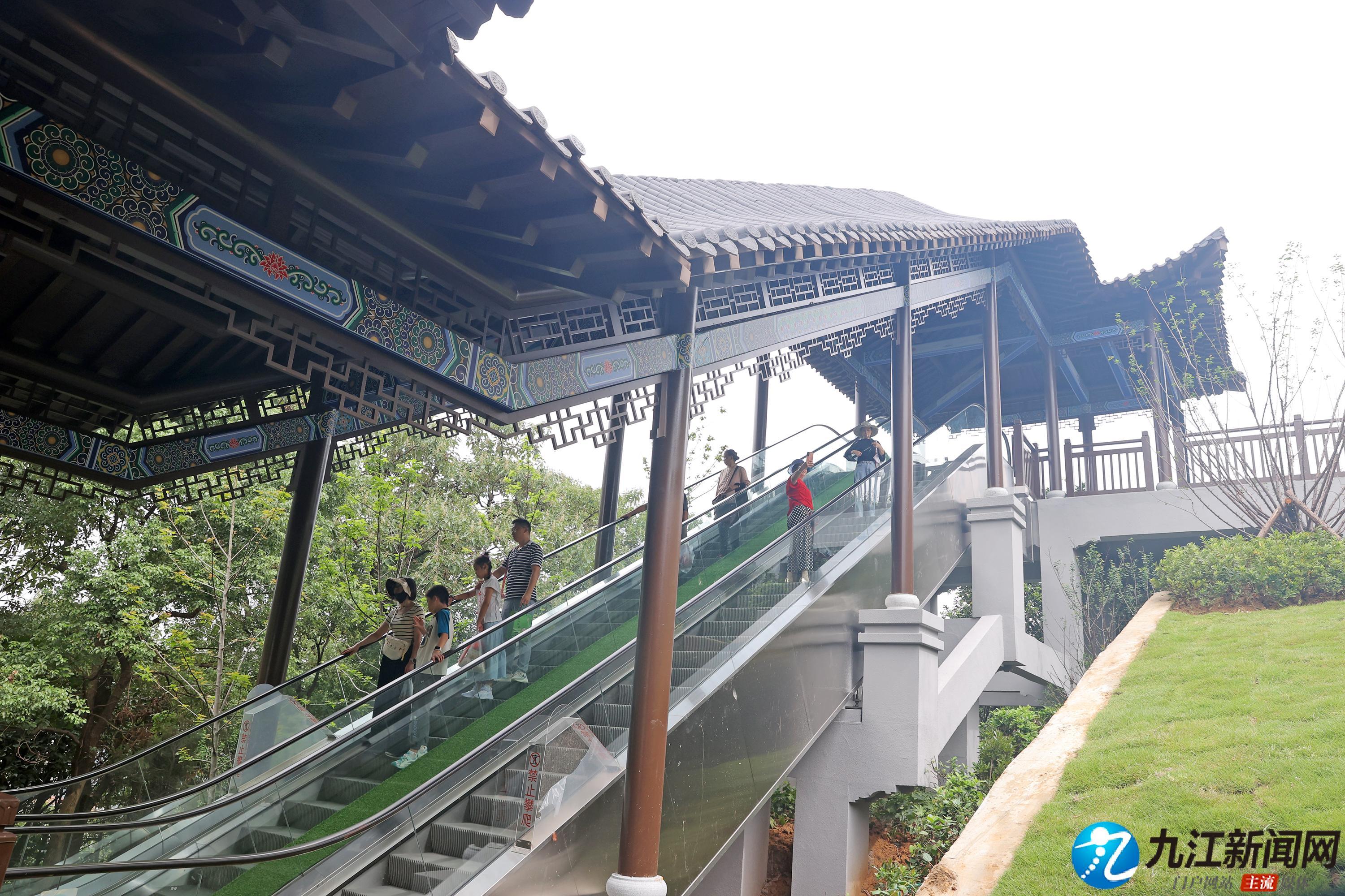 9月27日,位于濂溪区南山公园的德化楼处新增观光扶梯已建成完工并开放试运行,不少市民和游客一边乘坐扶梯一边拿出手机拍照。该扶梯垂直落差21米,设计上深度融合南山公园自然、文化元素,采用主体钢结构+仿古风格,造型与德化楼建筑风格形成美学呼应,兼具功能性与艺术性。(九江日报全媒记者 刘家 摄)