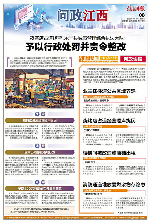 本报讯 (万礼妍 全媒体记者谢凌瑾)近日,吉安永丰县居民陈先生反映,恩江镇体育场旁一家名为“老地方夜宵城”的店铺长期存在占道经营、噪声扰民问题,影响周边居民日常生活。对此,永丰县城市管理综合执法大队回应,已对该店处以200元行政处罚,并责令其立即整改,后续将加大该区域巡查力度。