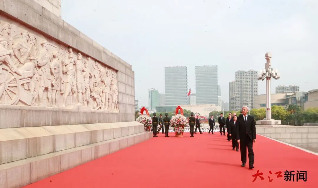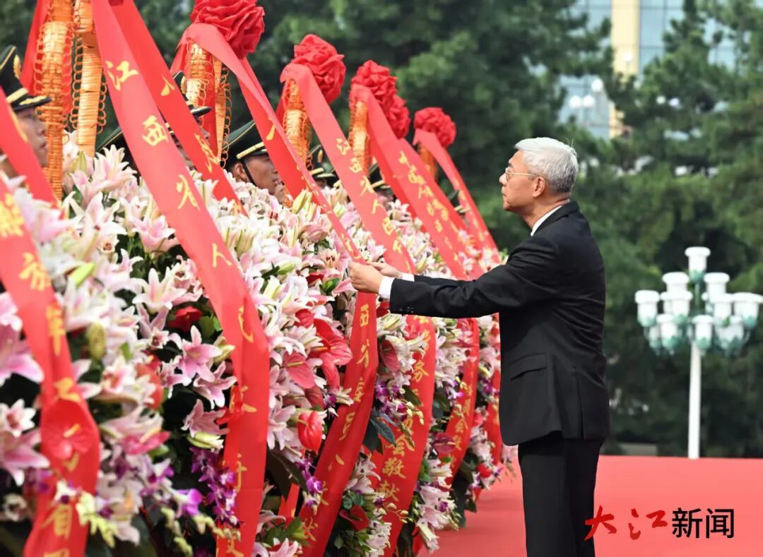 尹弘等省领导缓缓拾级而上,来到花篮前列队、肃立。尹弘迈步上前,在省委敬献的花篮前驻足凝视,仔细整理花篮缎带。随后,省领导和各界人士代表依次缓步绕行,瞻仰纪念塔、敬献鲜花。