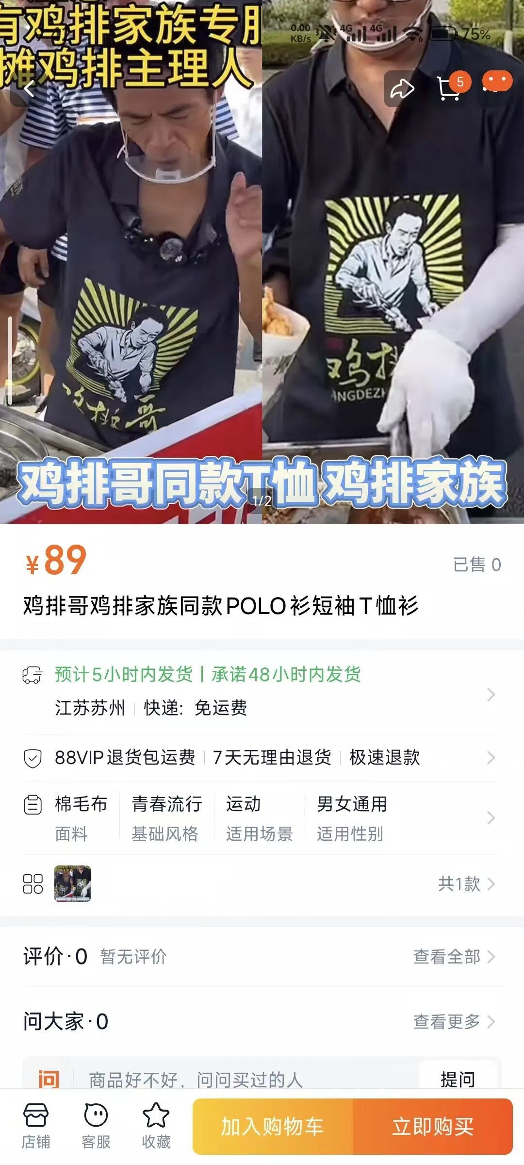鸡排哥”表示,这个国庆新方案的核心就是“合理分流,缩短游客等待时间”。然而,这个旨在提升顾客体验的统一标识,很快便遭遇了意外的风波。在“鸡排家族”摊位亮相的第二天,《都市现场》记者就在电商平台上发现了正在售卖的“鸡排家族同款T恤”——一款售价89元,一款售价65.9元。