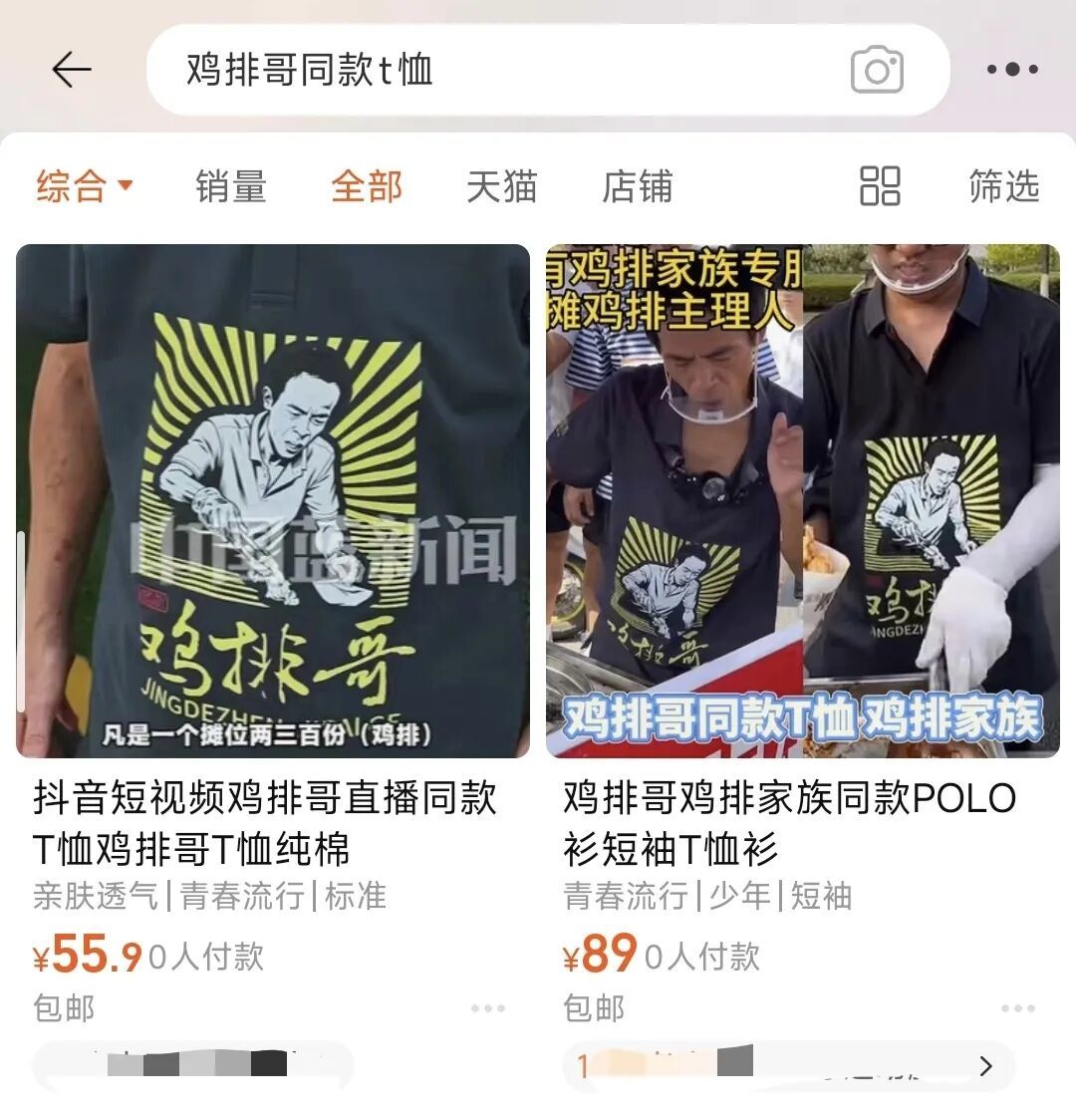 油锅里的鸡排滋滋作响,“鸡排哥”和家族成员们统一换上了专属T恤——正面印着他的形象和“鸡排哥”三个大字,背面则是“景德镇欢迎你”。可“鸡排哥”T恤亮相成标识仅一天,就有电商平台火速上架“同款T恤”。