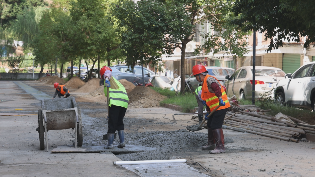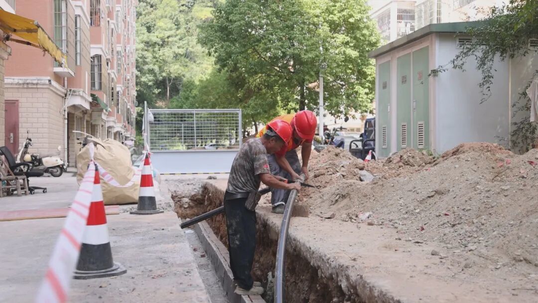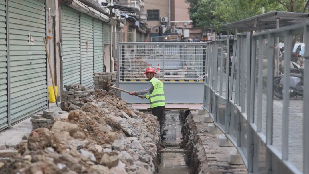 在新溪花苑、橙园小区等改造现场,施工人员正操作挖掘机、使用专业工具有序开挖路面,为地下管道更新做准备。不远处,外立管更新也在同步开展;在已完成管道铺设的区域上,水泥回填作业正抓紧进行,确保路面快速恢复平整。
