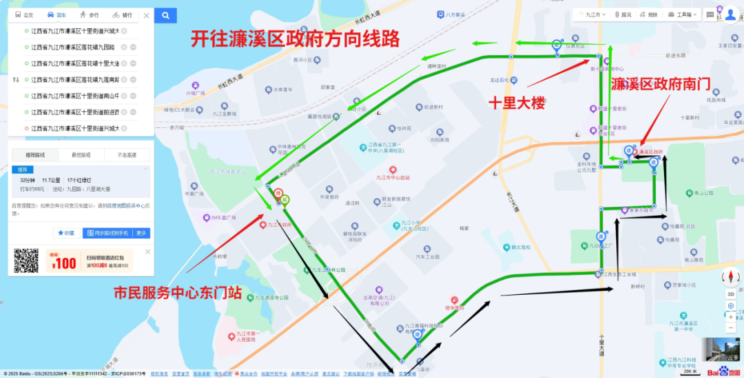 往返路线走向:祥和路东侧(九龙新城A区)——八里湖大道——柴桑路——渊明大道(柴桑区行政服务中心)。车辆停靠沿线公交站点。 详见下图: