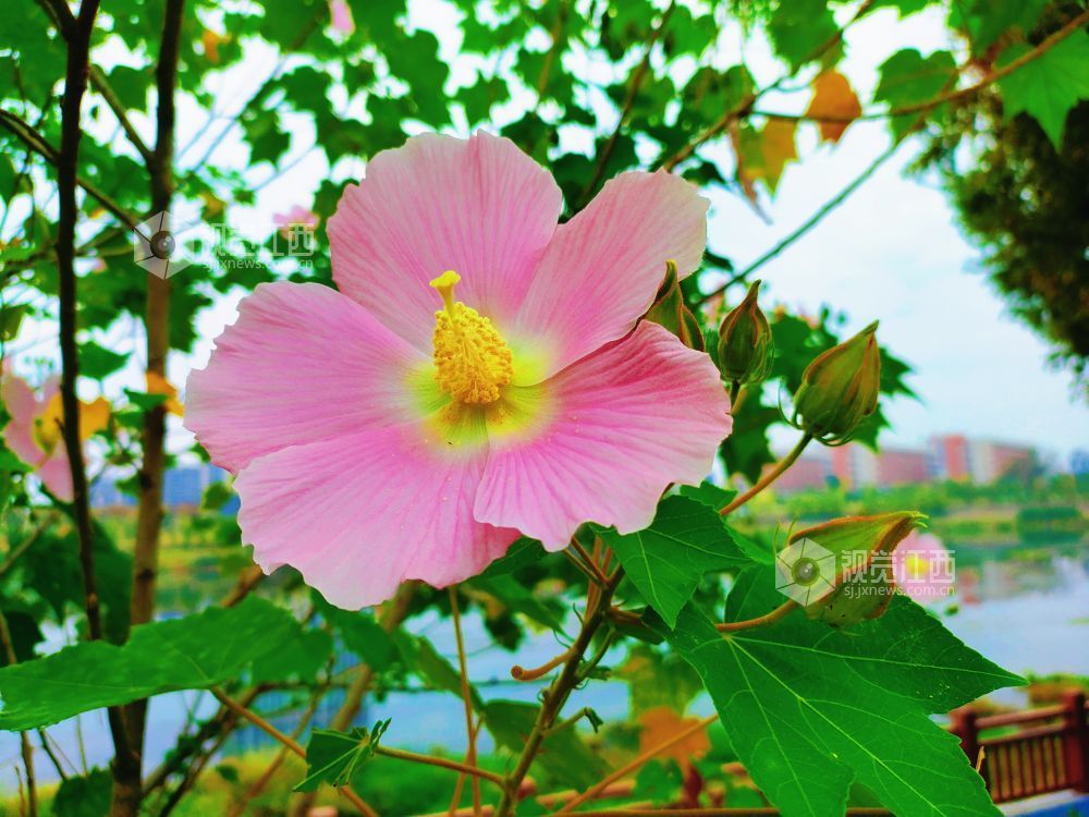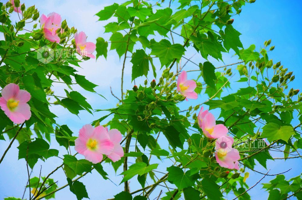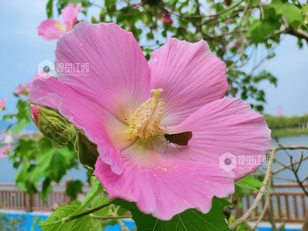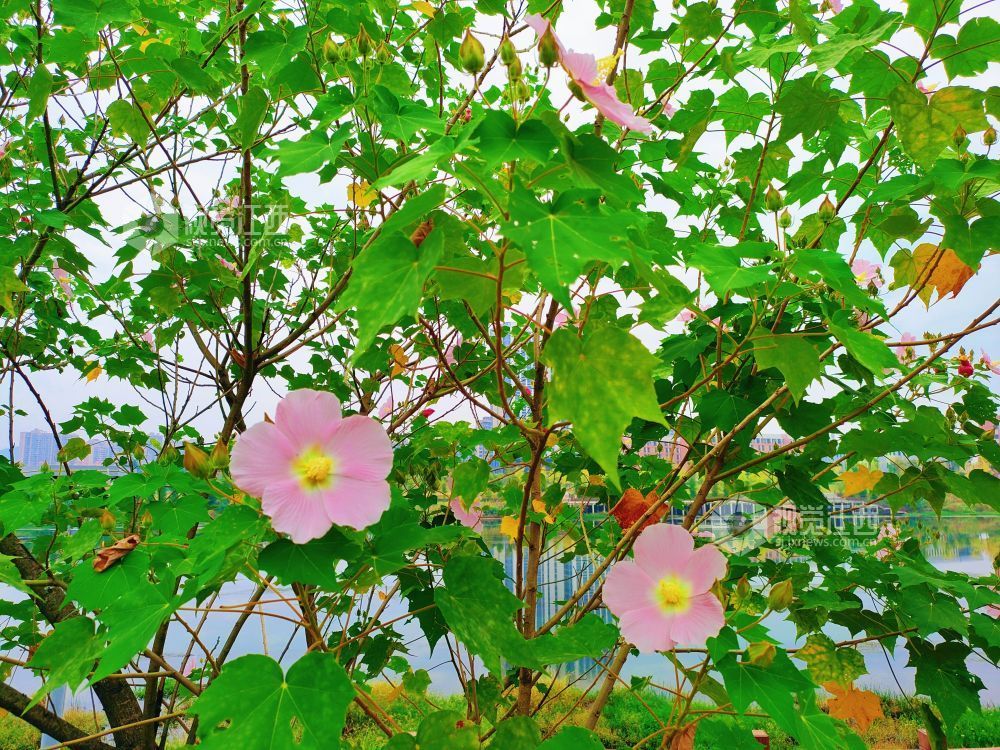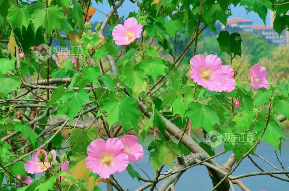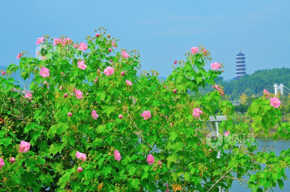 10月13日,江西省永新县滨江路上的木芙蓉迎风盛放。