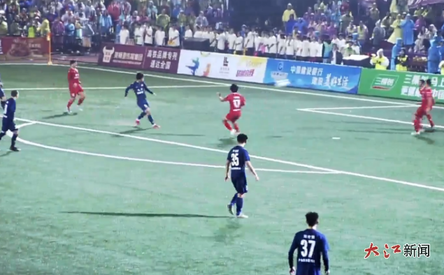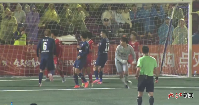 易边再战,现场下起了雨,在观众欢呼声中,双方依旧对抗激烈、互有攻防,比赛就此陷入胶着状态。第52分钟,抚州队获得任意球机会,可惜皮球与球门擦肩而过;第59分钟,双方球员一次身体对抗,甚至让1名球员“飞出”场地,溅起水花。体力消耗太大,双方不断换人。转机在第70分钟,九江队6号球员聂皓天头球破门,将比分锁定在抚州队1:3九江队。