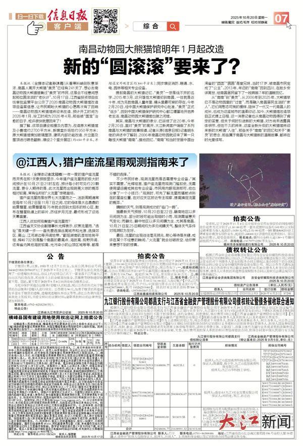 本报讯(全媒体记者孙沐雨)从春寒料峭到秋意渐浓,南昌人离开大熊猫“美灵”已经有241天了,想必去南昌动物园大熊猫馆看过“美灵”的市民,还是会不经意间想起那位圆滚滚的“老伙计”。10月17日,江西省投资项目在线审批监管平台公示了2026南昌动物园大熊猫馆改造项目备案信息,让市民期盼大熊猫的心愿再次有了回响——南昌动物园大熊猫馆将迎来改造,预计开工时间为2026年1月,竣工时间为2026年4月。那些被“国宝”治愈的日子,或许很快就要回来了!