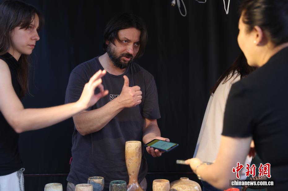 图为10月18日下午,一笔交易在白俄罗斯手艺人穆罕默德·埃尔·阿卜杜勒(Mohamed El Abd)的摊位上达成。他微笑着竖起大拇指,表达对顾客认可的感谢。这一刻,他收获的不仅是订单,更是一份来自瓷都的文化认同与友谊。中新社记者 刘占昆 摄