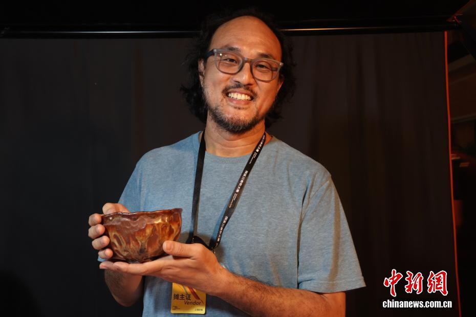 图为10月18日晚,新加坡陶艺家潘秉谦(Francis Poon)可以用一口流利的中文与民众毫无障碍地交流。他手持一个质感粗粝的陶碗,脸上洋溢着笑容,正自豪地介绍这件凝聚其个人风格的作品。中新社记者 刘占昆 摄