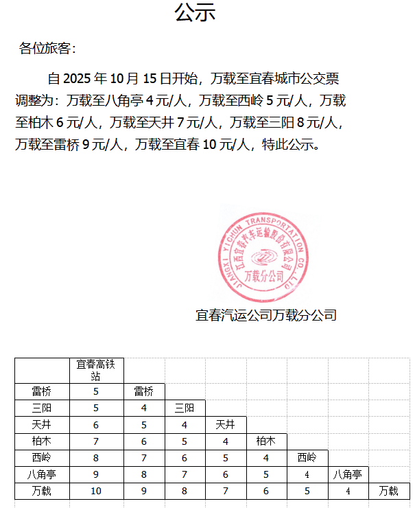 宜春汽车运输股份有限公司万载分公司经理杨暾介绍:“从10月15号开始,万载的大客车(万载至宜春),从原来的票价16元降至10元。万载至宜春的定制客运,由原来的25元降至当日购票20元,提前预订15元。”