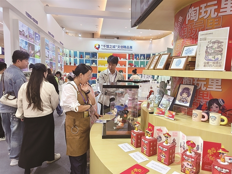 景德镇新闻网讯(全媒体记者 徐悦 文/图)10月18日,由市人民政府主办,市委宣传部和市文旅局承办的“千馆之城”文创精品展亮相2025瓷博会。展览面积达200平方米,汇聚了全市1000家场馆的文创资源,精选出151家企业的700件文创精品,开展首日便吸引近万名游客到场参观,现场人气爆棚。