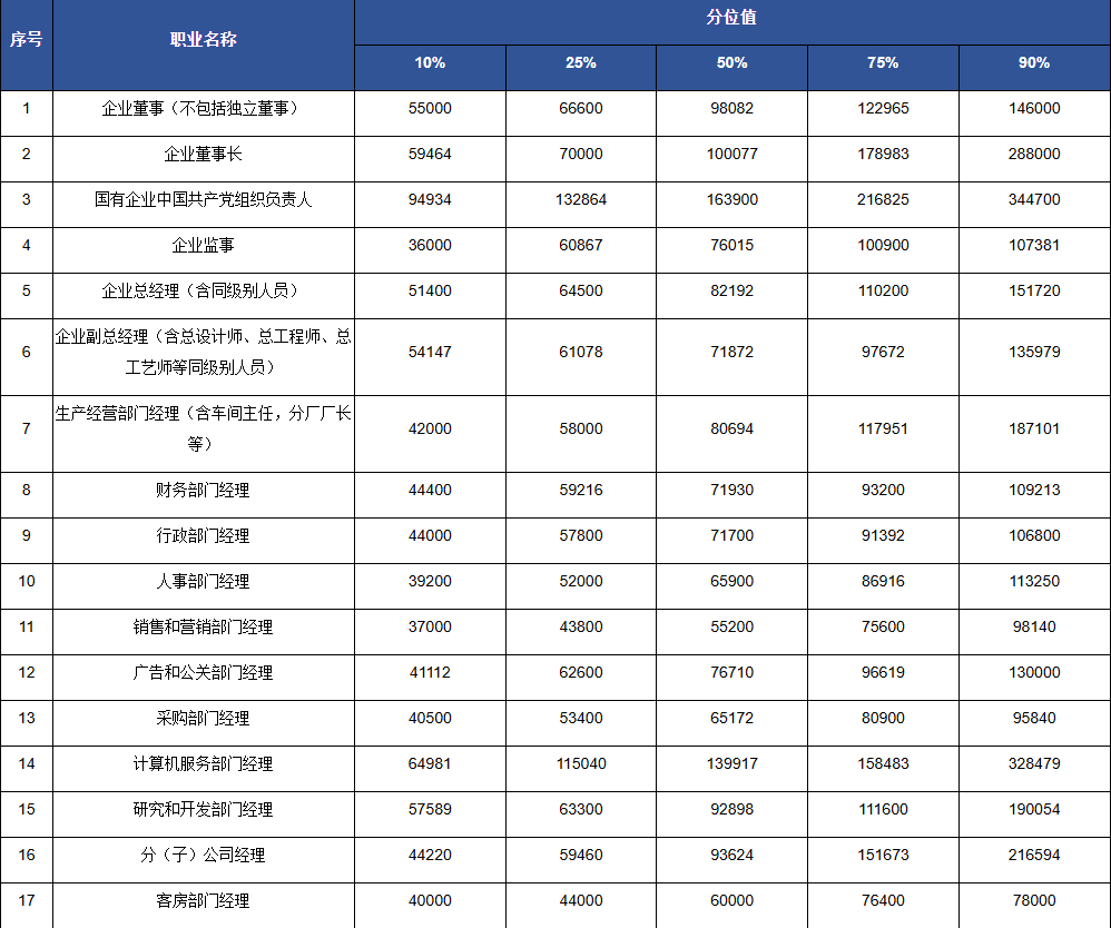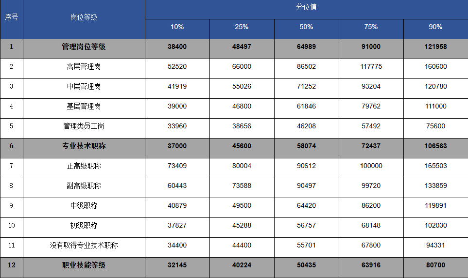 三、本次劳动力市场工资价位中包括了90分位(高位数)、75分位(上四分位数)、50分位(中位数)、25分位(下四分位数)、10分位(低位数)等市场分位值工资水平,适合于不同企业的需求。同一职位工资价位的不同分位值水平,一般由企业经济效益和劳动者综合素质等因素决定。