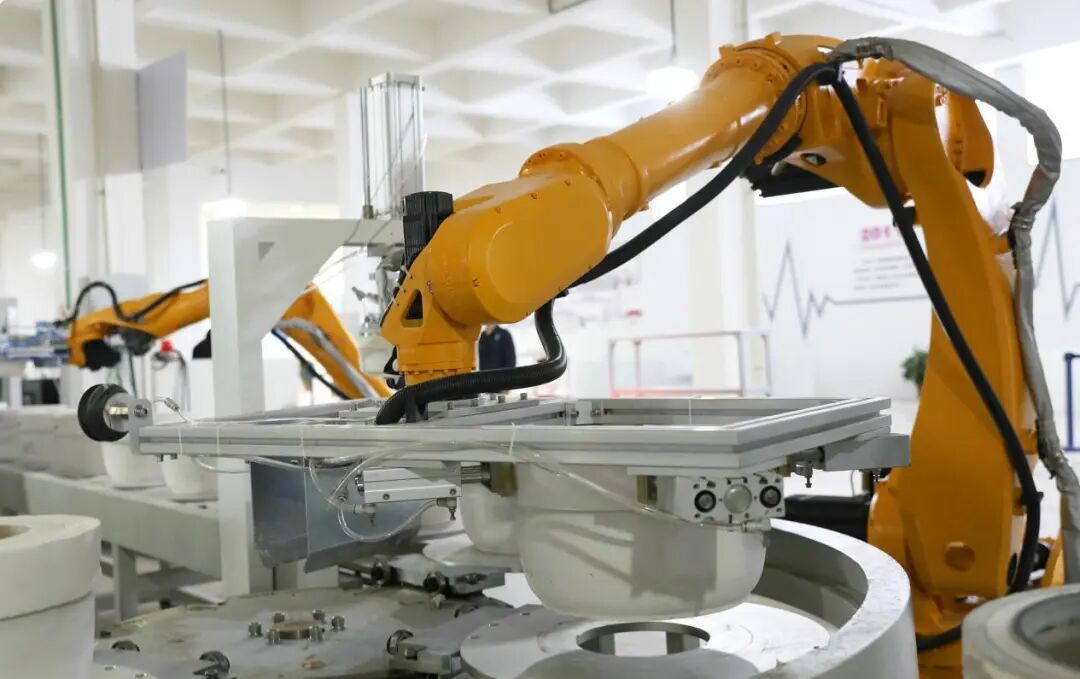 展区工作人员指着一件瓷品介绍:“这流畅的线条,来自全自动数控滚压成型生产线,精准釉色出自智能上釉机器人。”