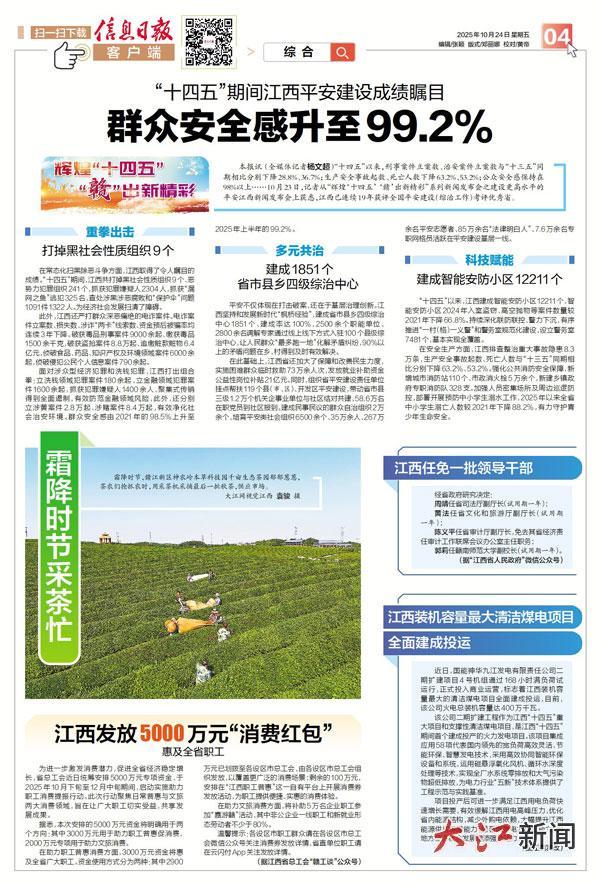 在安全生产方面,江西排查整治重大事故隐患8.3万条,生产安全事故起数、死亡人数与“十三五”同期相比分别下降63.2%、53.2%。强化公共消防安全保障,新增城市消防站110个、市政消火栓5万余个,新建乡镇政府专职消防队328支。加强人员密集场所及周边巡逻防控,部署开展预防中小学生溺水工作,2025年以来全省中小学生溺亡人数较2021年下降88.2%,有力守护青少年生命安全。