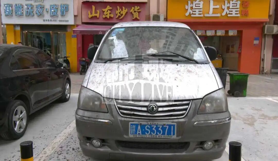 《都市现场》记者来到阳光家园附近的洪腾高架下,发现一处停车场内有十几台汽车中了招,引擎盖、玻璃、顶棚上到处都是黑色的污染物。