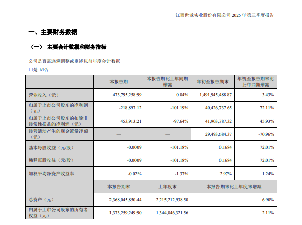 10月23日,江西世龙实业股份有限公司(以下简称“世龙实业”)公布2025年度第三季度报告。报告显示,前三季度该公司共实现营业收入14.92亿元,同比增长3.43%,实现净利润4042.67万元,同比增长72.11%。