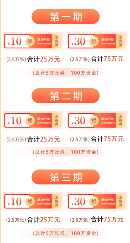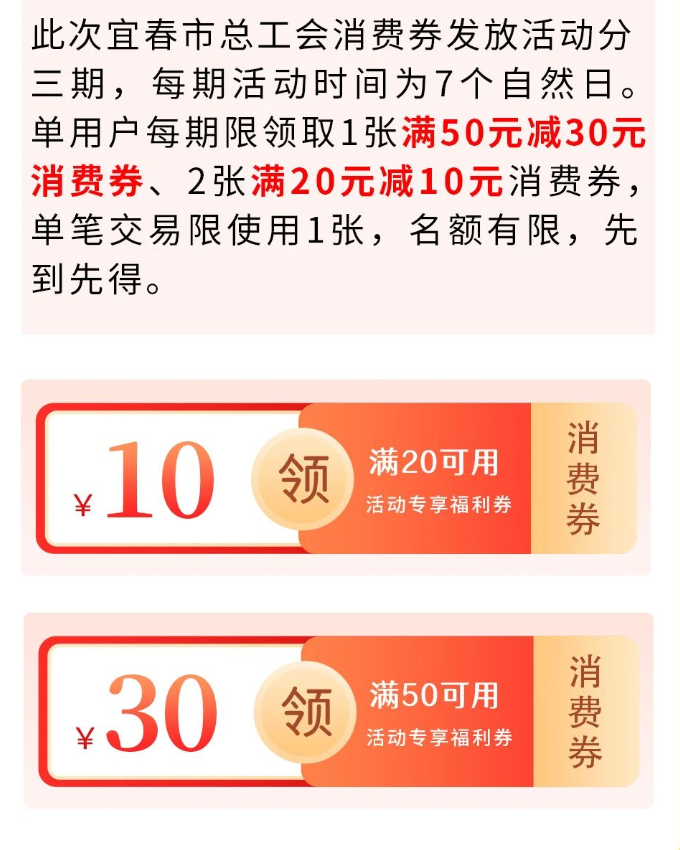 其中,第一期发放时间为10月26日20:00;第二期、第三期将分别于11月16日、11月23日启动,每期活动持续7个自然日。为保障更多职工能够受益,活动规定单用户每期仅可领取1张满50元减30元的消费券、2张满20元减10元的消费券,且单笔交易限使用1张。消费券名额有限,采取“先到先得”的方式发放。