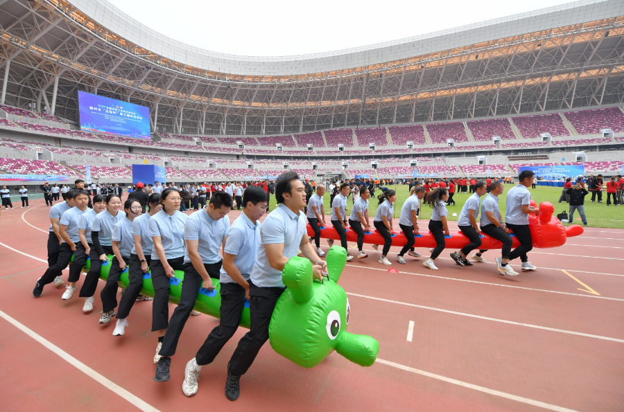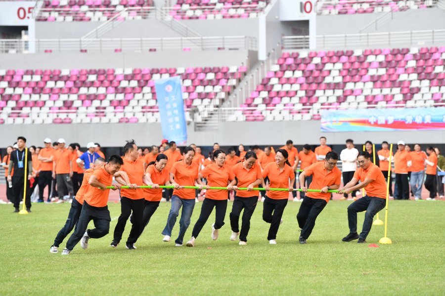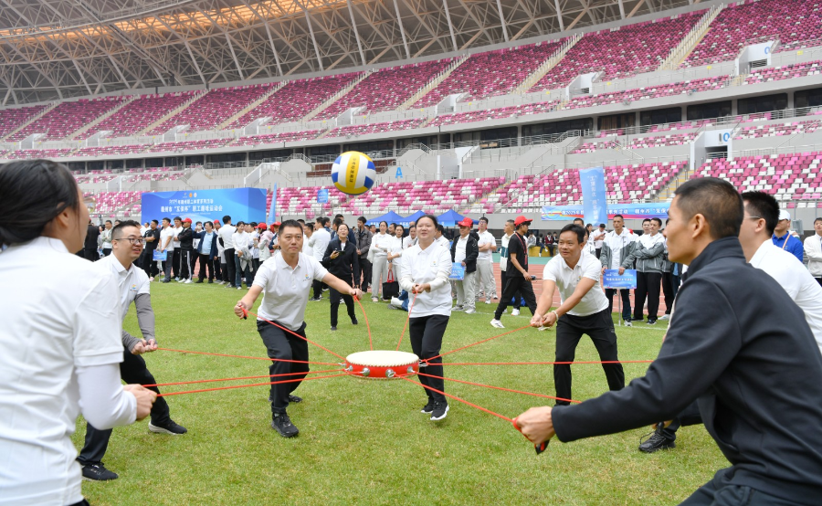 本次运动会以“‘工’聚活力 ‘趣’享健康”为主题,涵盖趣味毛毛虫赛跑、一锤定音接力跑、同心鼓颠球、运转乾坤、快乐传递呼啦圈等5个趣味项目,划分县(市、区)职工组、市直(驻市)职工组、工会系统组、新就业形态职工组等4个组别。参赛选手们在轻松愉快的氛围中充分体验到运动的乐趣。在趣味毛毛虫赛跑中,队员们手握把手,齐心协力将“毛毛虫”运送到终点,大家步调一致、口号响亮;在一锤定音接力跑比赛中,大家肩扛大气锤,你追我赶、争先恐后地跑到指定位置砸气球,现场欢声笑语不断;在同心鼓颠球项目中,大家瞄准目标精准发力,排球在空中弹跳,精准落在鼓面上,引得周围惊叹连连;在运转乾坤比赛中,队员们相互协作、齐头并进,展现出强大的团队凝聚力;在快乐传递呼啦圈项目中,参赛选手们手牵手,依次让呼啦圈穿过身体,并敏捷地传递给下一位队友。现场加油呐喊声此起彼伏,气氛热烈。