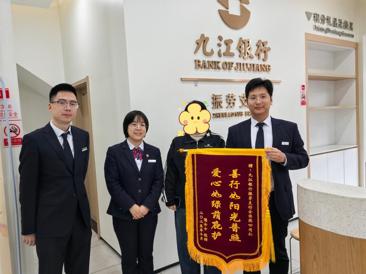 一面锦旗,承载着群众的认可;一次救助,彰显了党员本色。九江银行振劳支行员工用实际行动诠释了“为民服务”的初心,展现了金融从业者的责任与担当,也让“九银温度”与“党员担当”深度融合,传递出温暖人心的正能量。(文/叶贝颜)