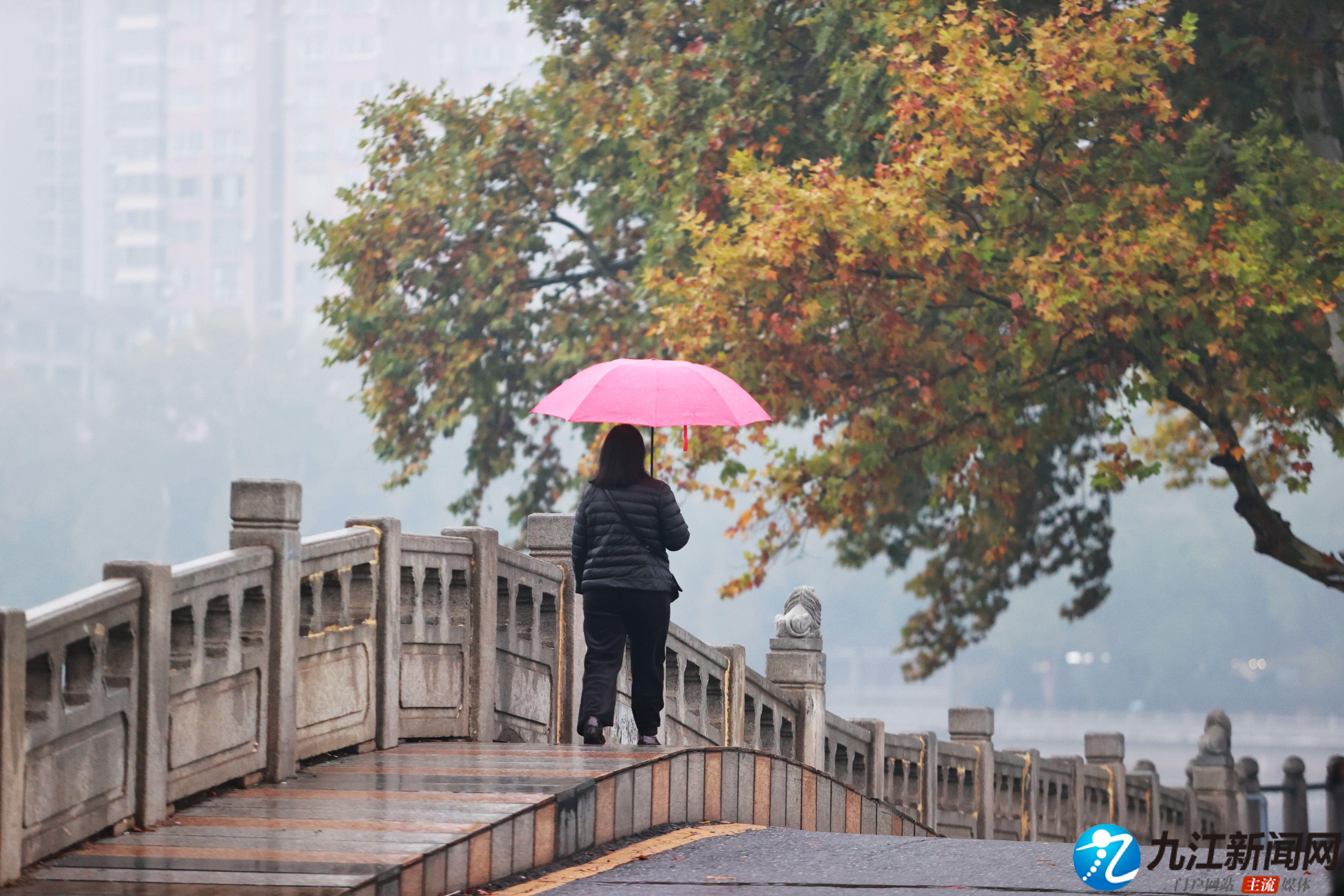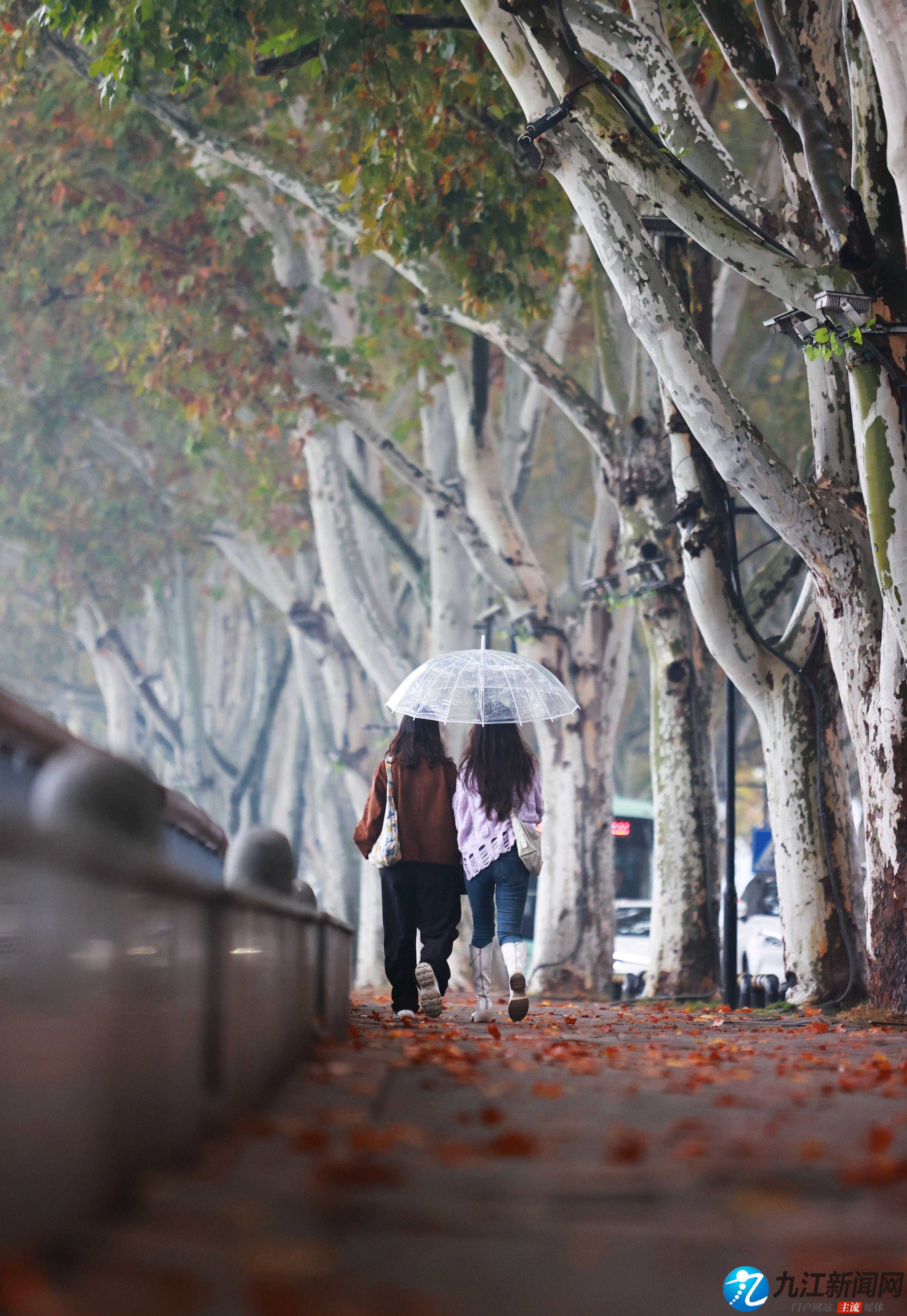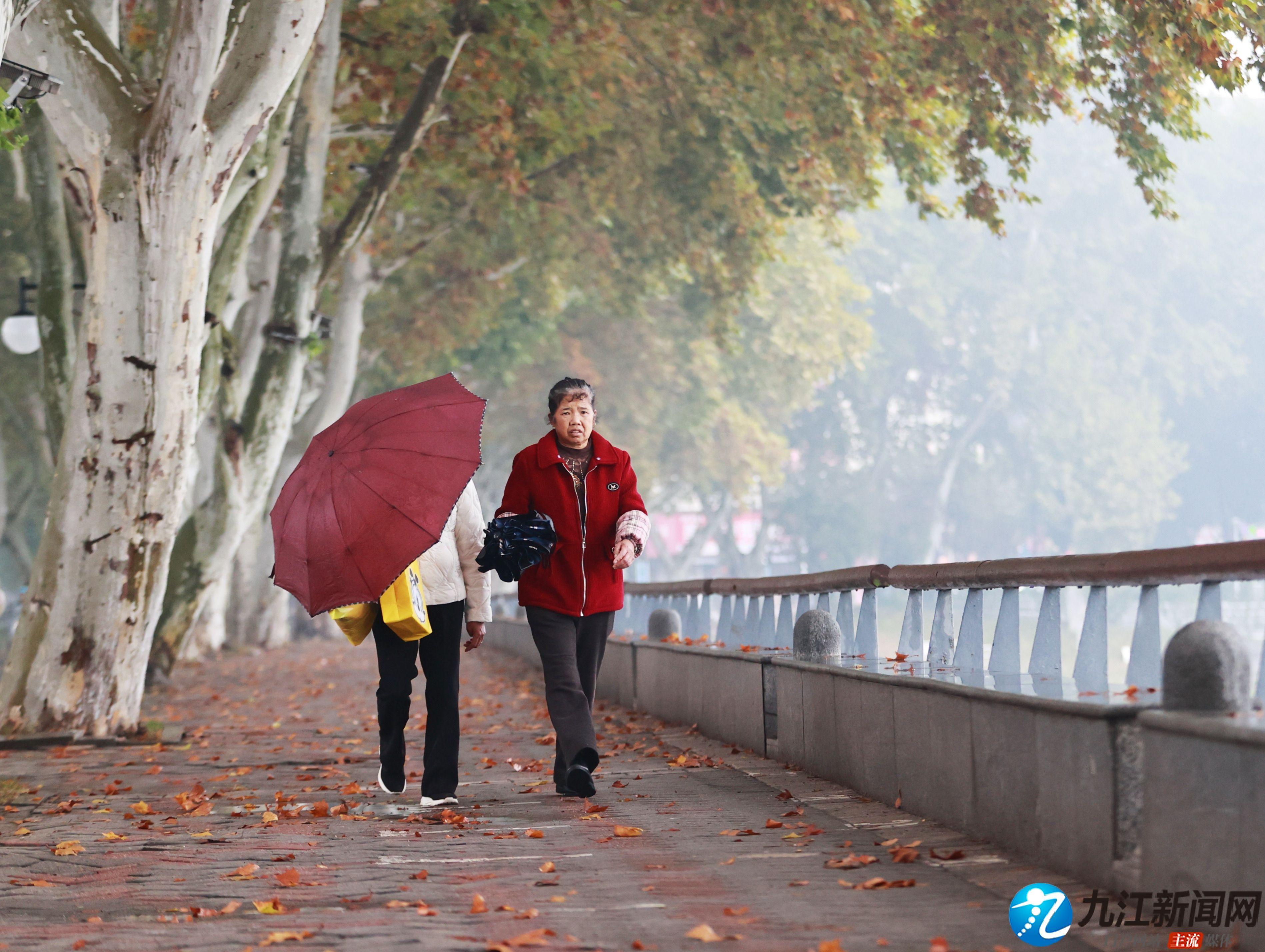 10月30日,雨后的浔城落叶缤纷,市区李公堤秋意浓浓,行人漫步其间,享受着这份秋日独有的静谧与惬意。(九江日报全媒记者 张驰 摄)