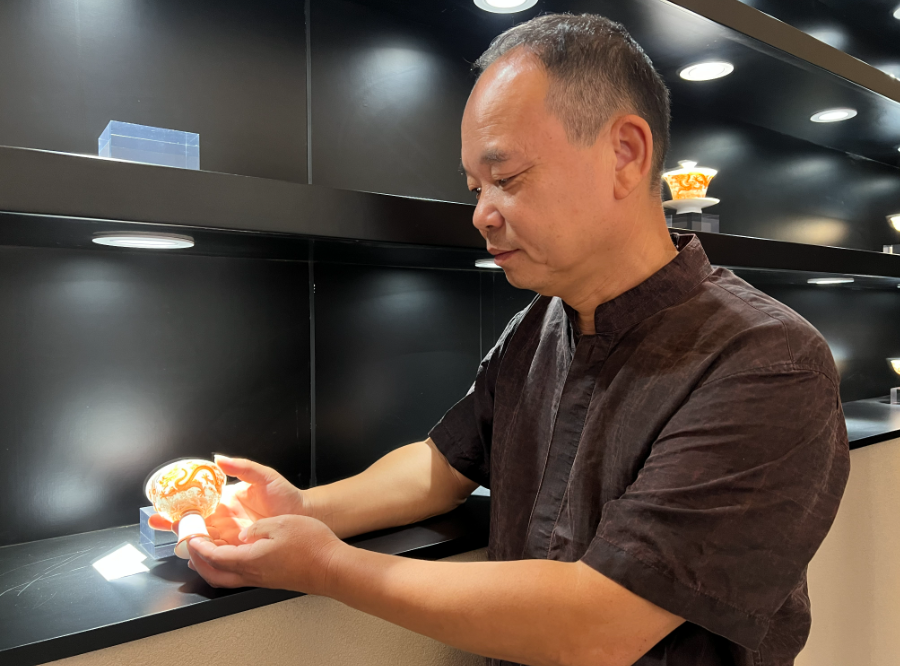 罗文波站在一组罗氏红高足大婚瓷前细细讲解。周佳/摄
